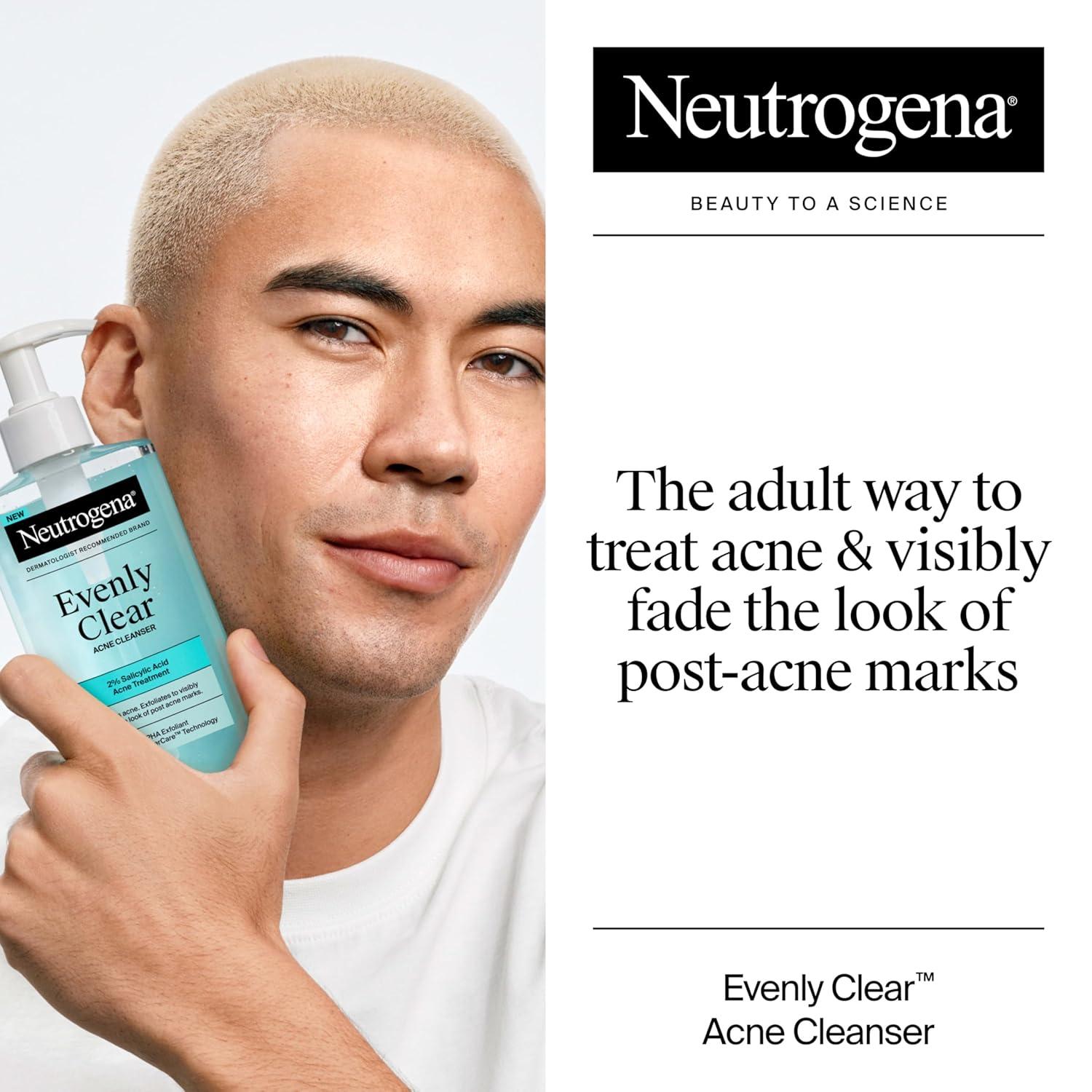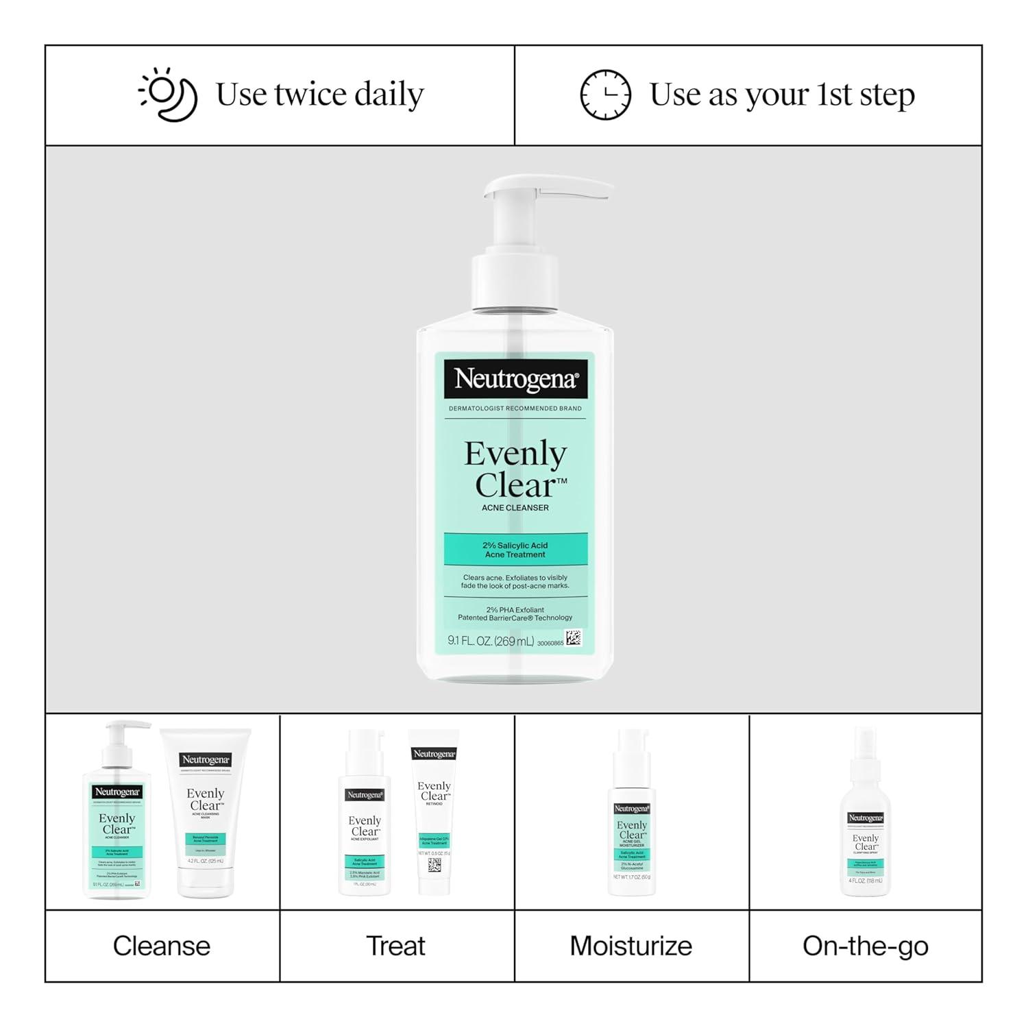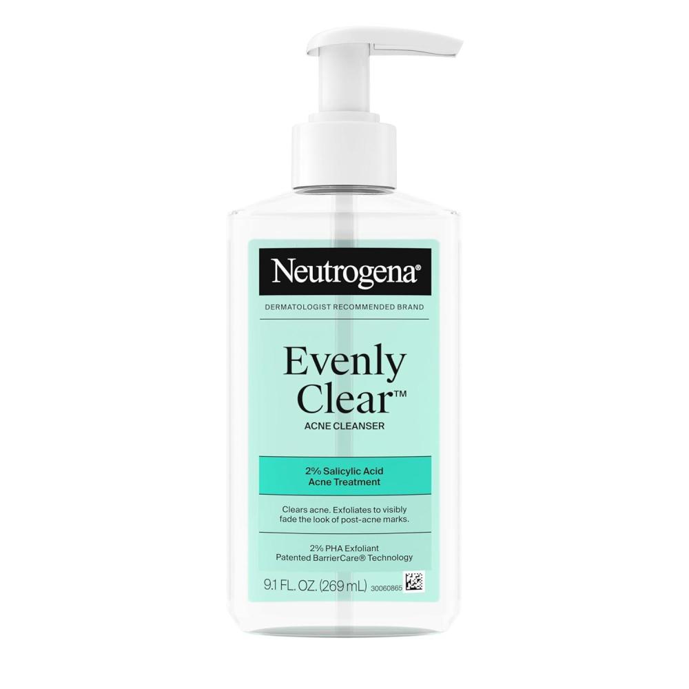 9.1-fluid ounce bottle of Neutrogena Evenly Clear Acne Cleanser with 2% Salicylic Acid Acne Treatment and 2% PHA Exfoliant that visibly fades the look of post-acne marks, clears acne, helps prevent future breakouts, for smooth, even looking skin
