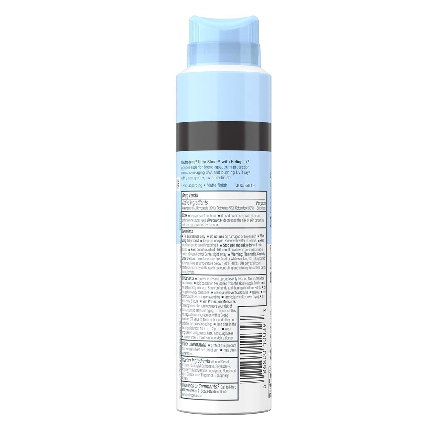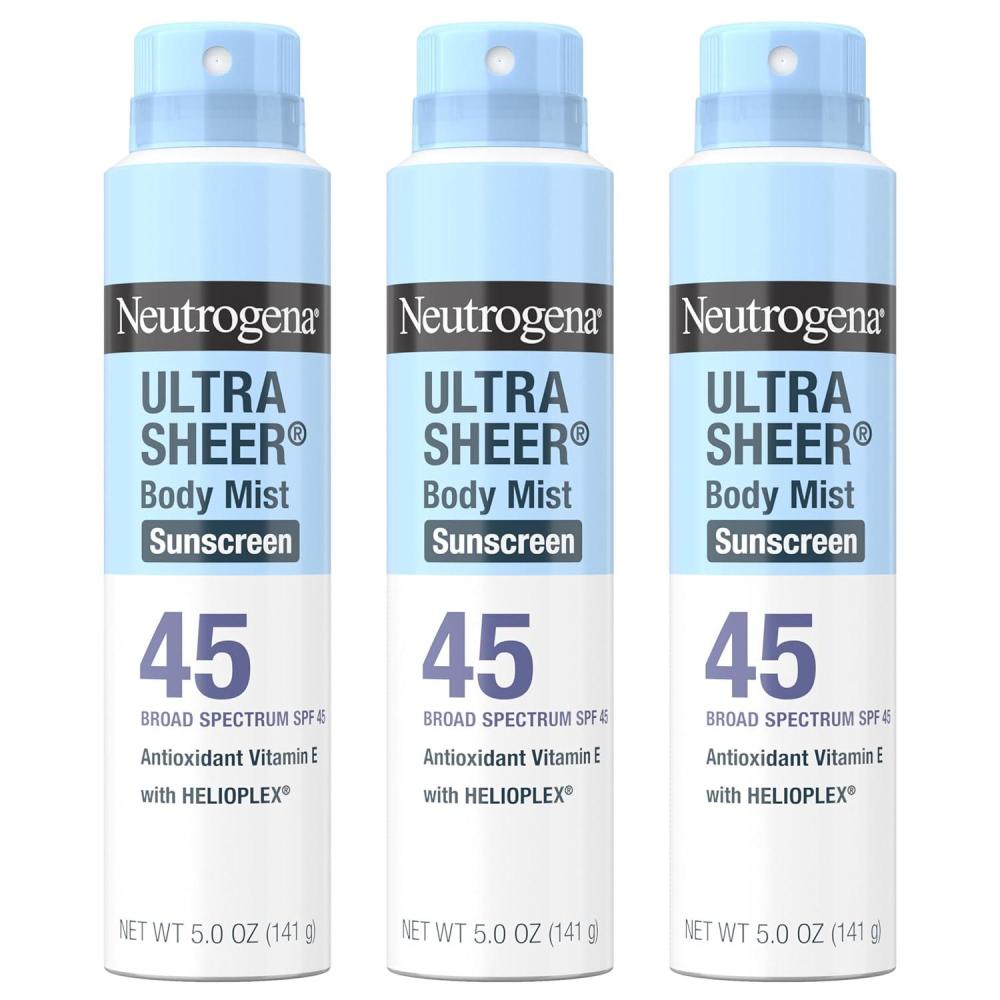 Package includes Three, 5 ounce cans of Neutrogena Ultra Sheer Body Mist Sunscreen Spray with Broad Spectrum SPF 45. Powerful sun protection to prevent sunburn. It features Helioplex technology for superior UVA/UVB defense