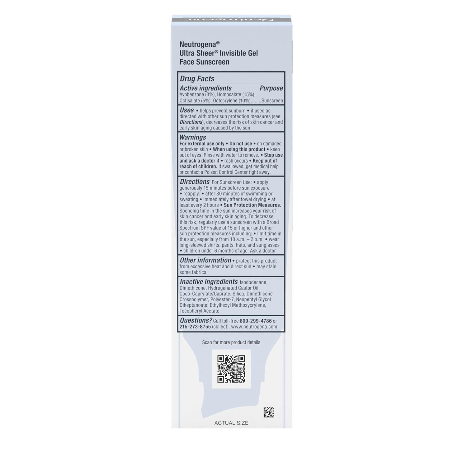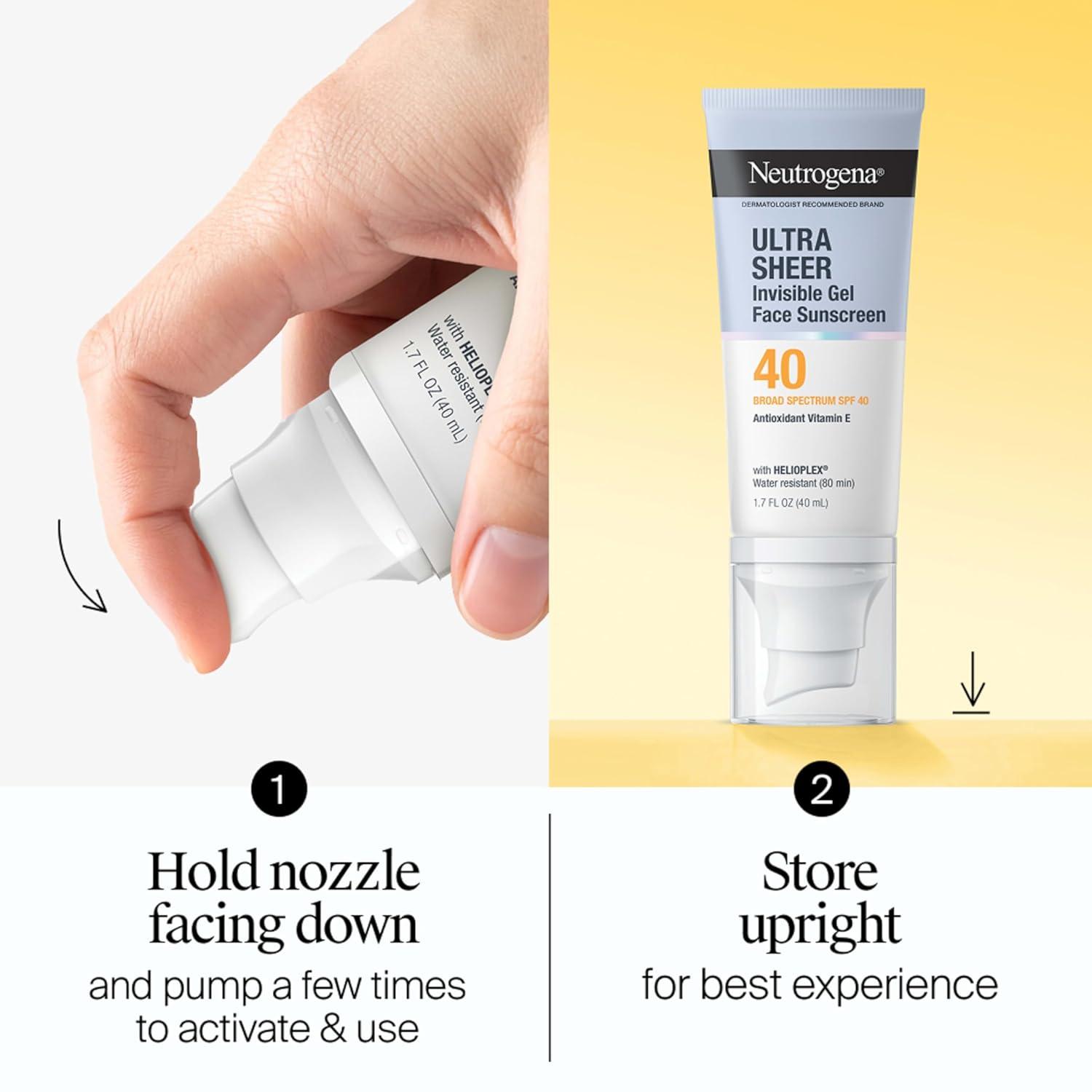 Looking for invisible protection you can trust, at a fraction of the price?* Neutrogena Ultra Sheer Invisible Gel Face Sunscreen SPF 40 is your new go-to face moisturizer with SPF for daily sun care. It’s Sunscreen You Can’t See! This lightweight, fast-absorbing sunscreen for face goes on clear with a velvety matte finish, making it the perfect under makeup sunscreen and face primer. Powered by Helioplex Technology, a photostable broad-spectrum UVA/UVB protection, and antioxidant Vitamin E, it helps improve skin complexion and radiance. Suitable for all skin types and tones, including sensitive skin, this fragrance-free, oxybenzone-free, paraben-free face gel with sunscreen for women & men is water-resistant for 80 minutes. 9 out of 10 agree it’s breathable, soft-touch, and easy to apply. Try Neutrogena face gel with SPF for invisible sun protection and a premium feel. *Of leading gel competitor, based on Stackline data for suncare category L52W WE 4/19/25